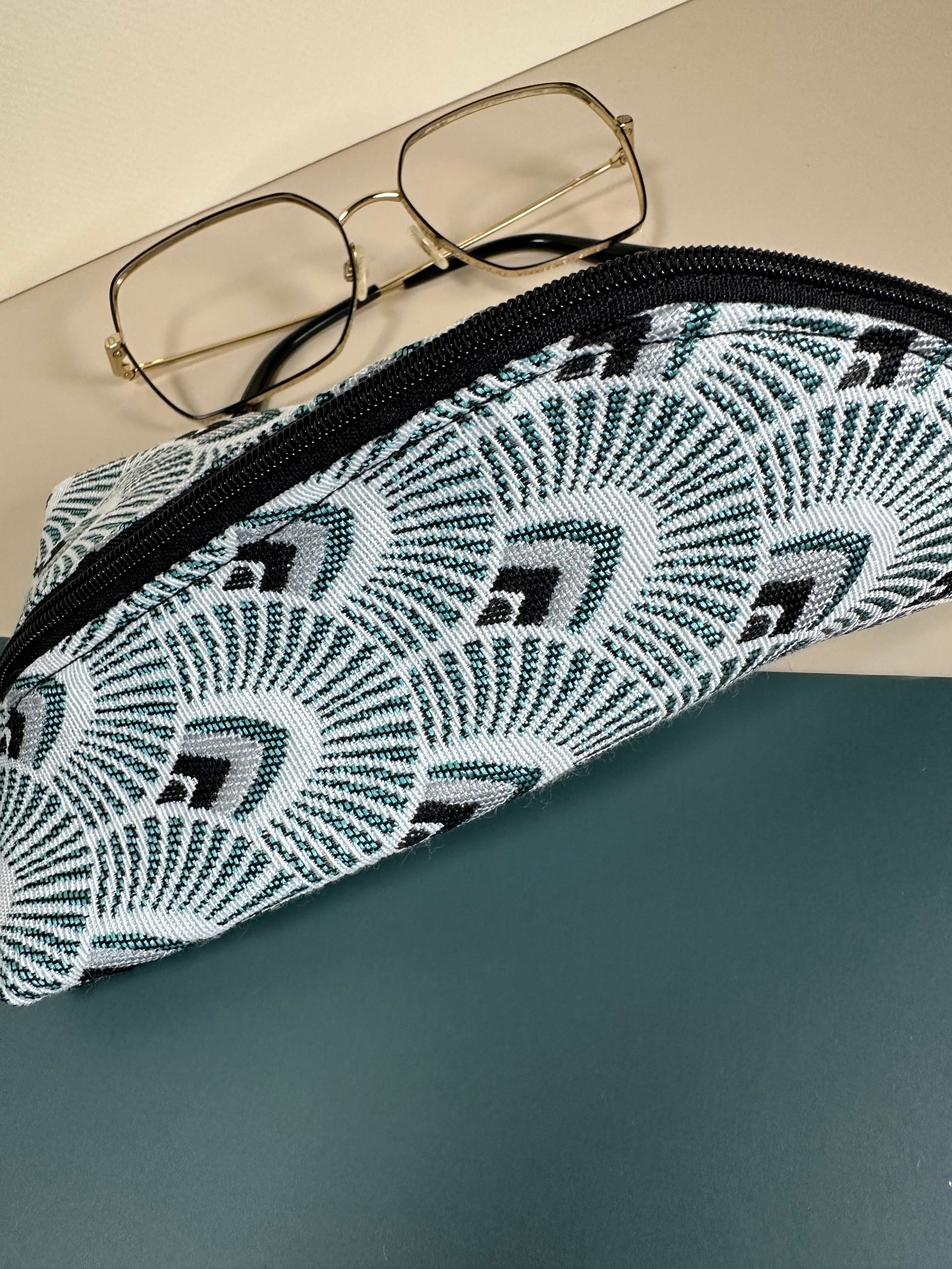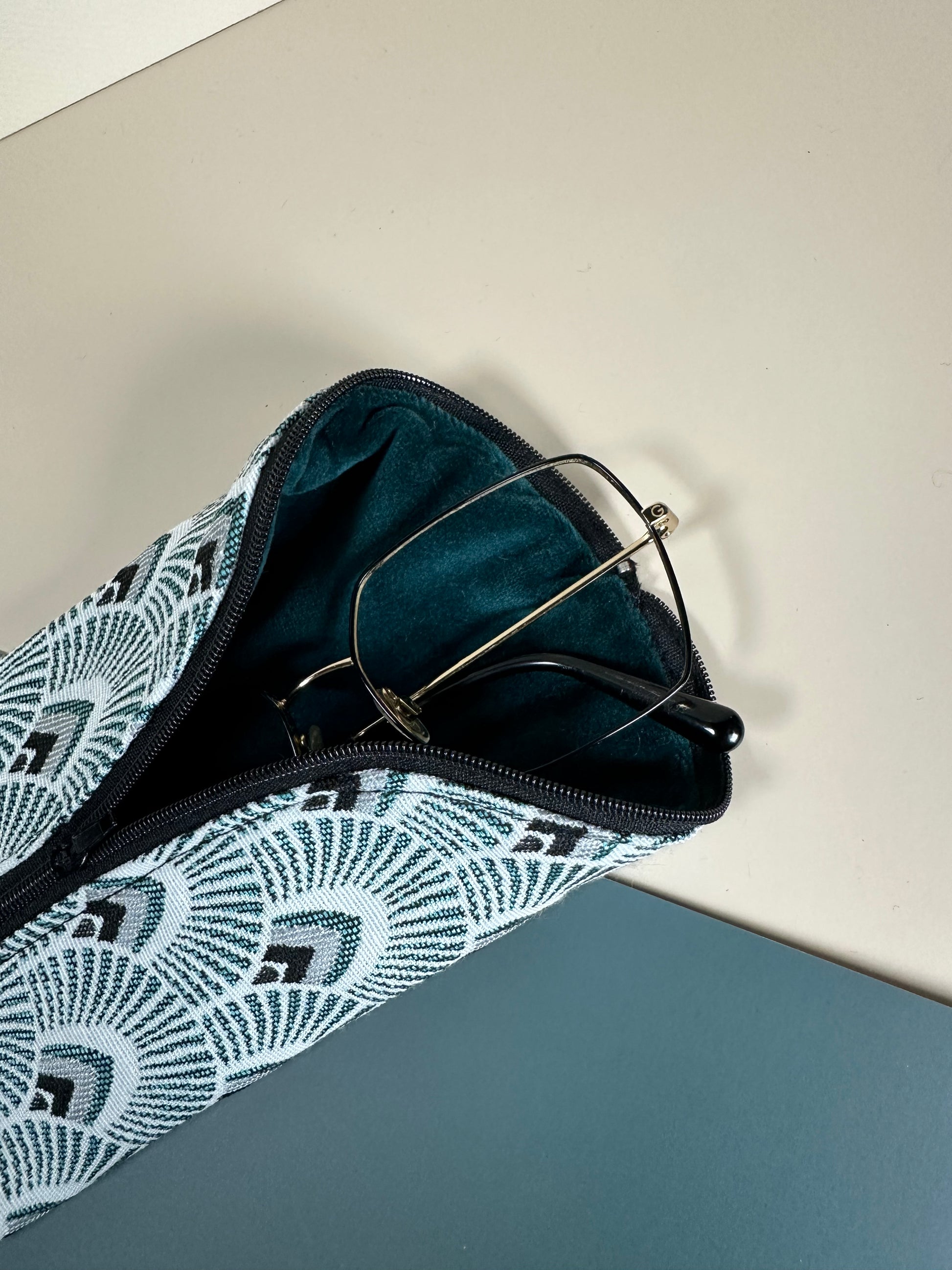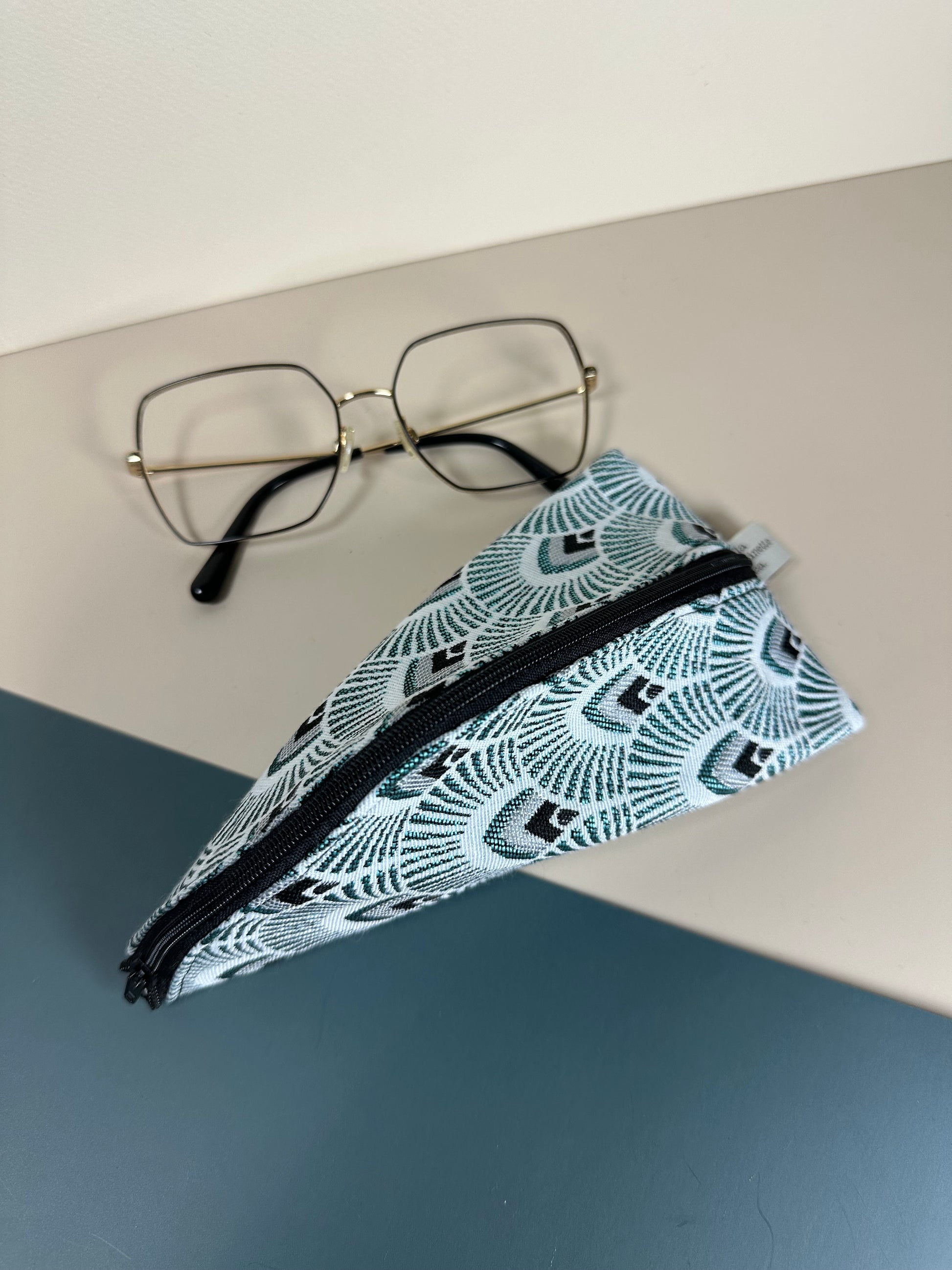 Trousse étui ,forme Berlingot, en tissu jacquard écailles turquoises.